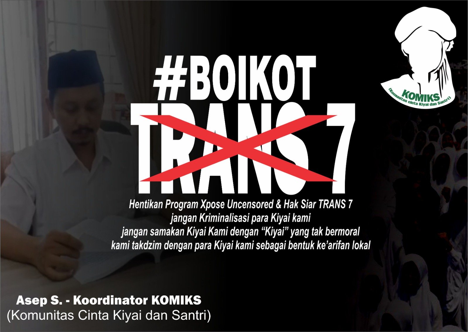“Kami sangat mengecam keras atas framing jahat Trans7, mereka tidak hanya memfitnah Kiyai tapi ini bentuk dari penggiring opini jahat, kami minta untuk diproses secara kode etik jurnalistik dan diproses secara Hukum “. Ungkap Asep S., selaku kordinator (komunitas cinta kiyai dan santri).