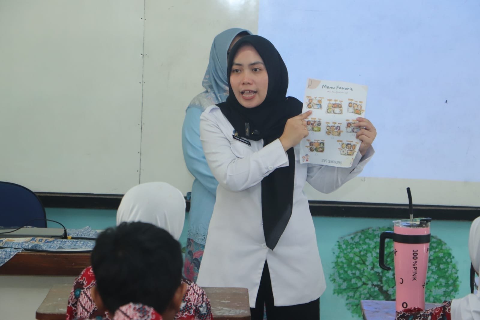 “Di sini ada selembar kertas berisi beberapa pilihan menu. Adik-adik bisa pilih mana yang paling disukai. Semoga ke depannya anak-anak tetap senang dengan menu makan bergizi yang kami sajikan,” ujar Triya di hadapan siswa.