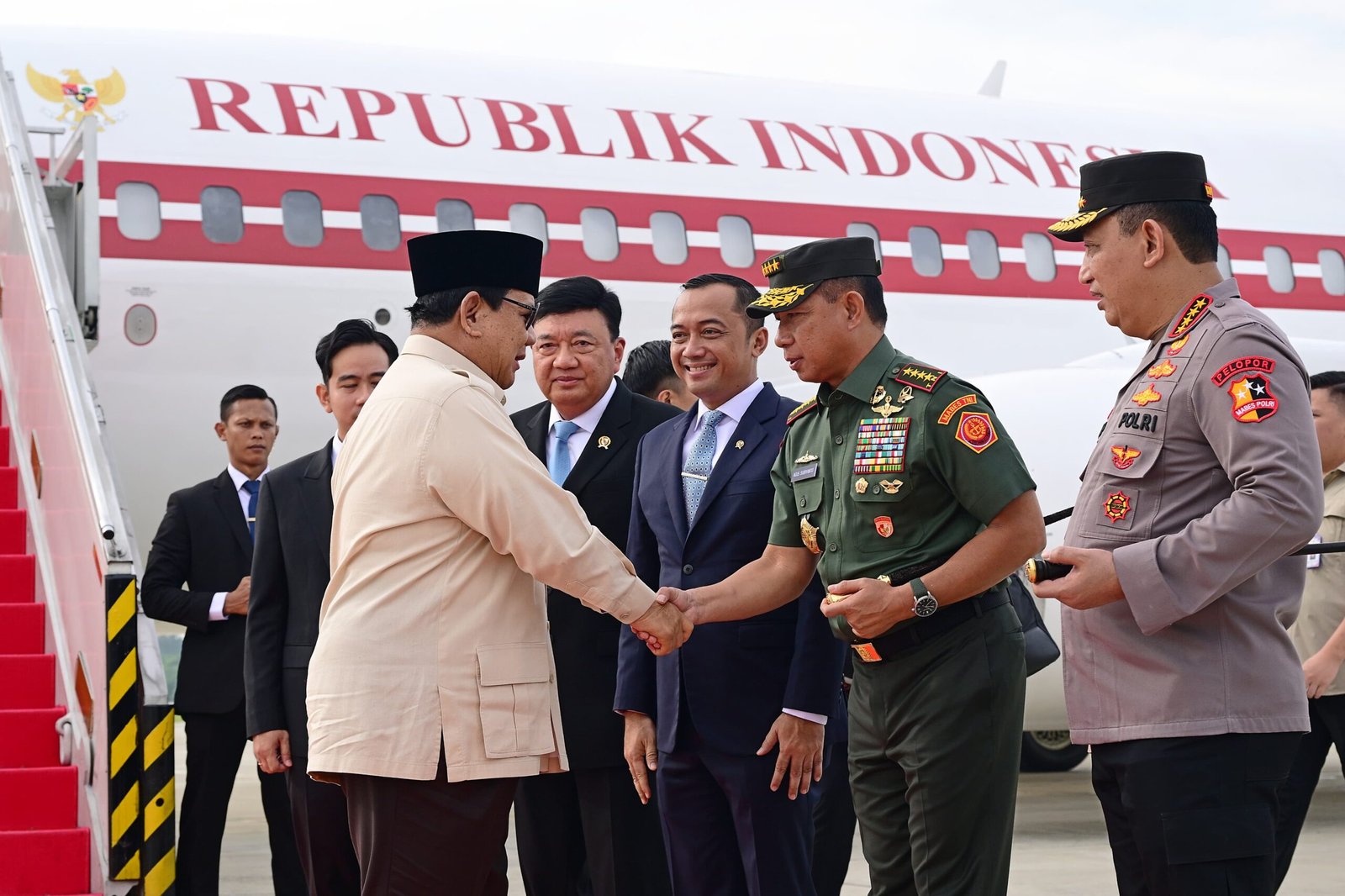 SwaraBhayangkara.id – (Puspen TNI) – Jakarta – Panglima TNI Jenderal TNI Agus Subiyanto menyambut kedatangan Presiden Republik Indonesia Prabowo Subianto usai melaksanakan kunjungan kerja ke lima negara di kawasan Timur Tengah, bertempat di Baseops Lanud Halim Perdanakusuma, Jakarta Timur, Selasa (15/04/2025).