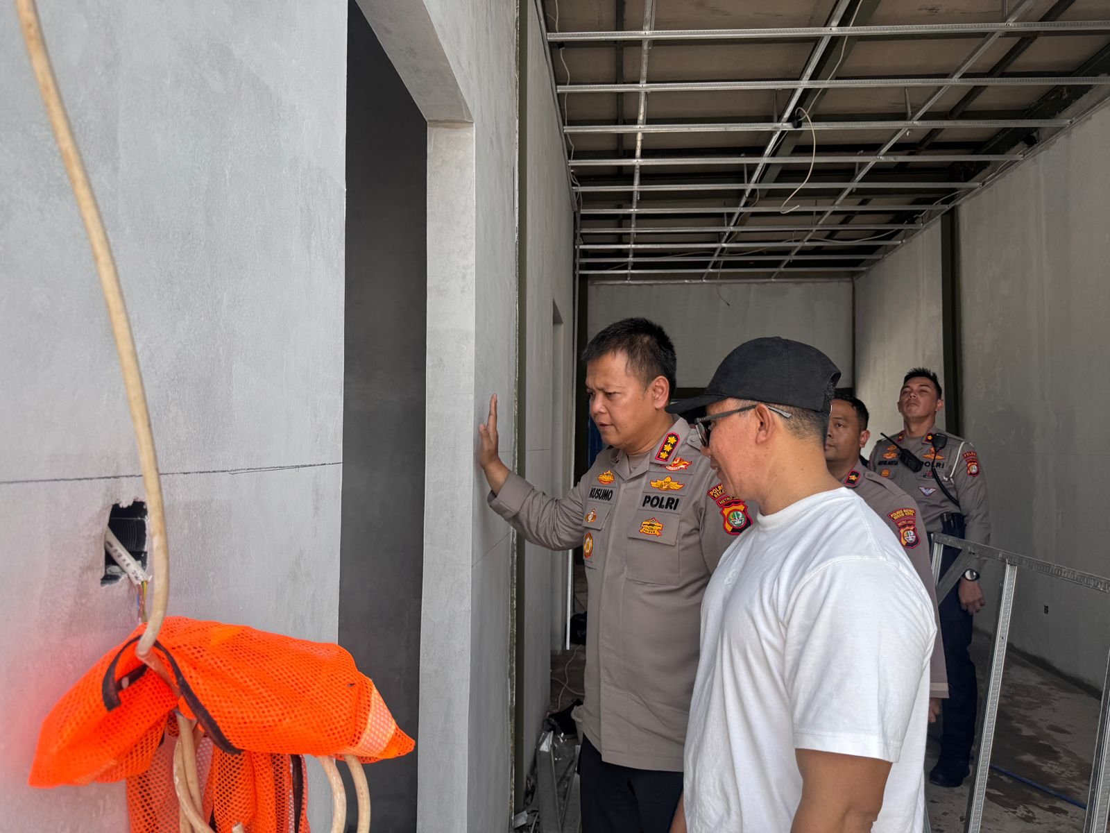 Kapolres Kombes Pol Kusumo Wahyu Bintoro didampingi Dirpolairud Kombes Pol Joko Sadono meninjau lokasi dan menjelaskan detail proyek tersebut, yang berlokasi di wilayah Mapolsek Bekasi Selatan.